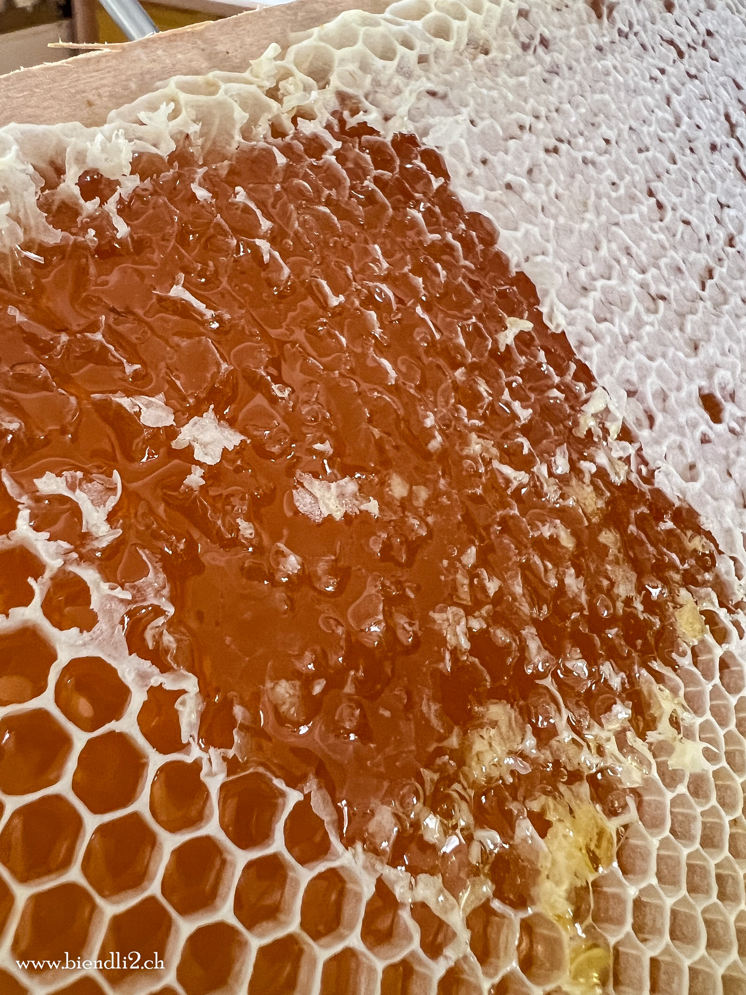 Sobald der Honig reif ist, verdeckeln die Bienen ihn mit einem Wachsdeckel. Beim Schleudern muss zuerst dieser Deckel entfernt werden, bevor die Waben in die Schleuder kommen.